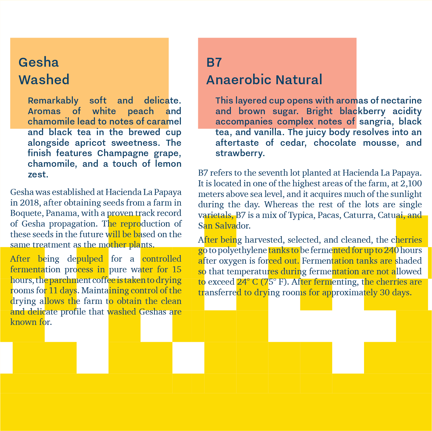 The Tasting Collection consists of six 2oz pouches of coffee—each the perfect size for a standard Chemex brew to share with another coffee fanatic. Here are the lots included in the collection: